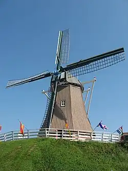 De Immigrant is a windmill located in Fulton, Illinois, built on a flood control dike on the Mississippi River. The City of Fulton contracted Molema Millbuilders, Havenga Construction, and Lowlands Management on December 4, 1998, to construct a Dutch windmill, to be fabricated by native millwrights in the Netherlands and shipped to Fulton for assembly. Two months later, construction began with thirty metric tons of wood. The construction took place in phases, and the tower, cap, sails, and machinery were all put together on November 19, 1999. On May 5, 2001, De Immigrant officially began grinding wheat, buckwheat, rye, and cornmeal.[1]