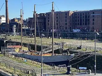Following her purchase by the museum, she arrived off the Mersey Bar on 5 August 1984 after having travelled from Dunoon, and anchored off of Monks Ferry until the next day.[11] She was then moored in the Canning Half Tide Dock outside of the museum building itself.[12] Between 1984 and 1987, the additional superstructure she had gained during her final years of service was gradually removed and placed into storage due to suffering damage caused by rot, as well as the museum wishing to restore her to her Irish Sea Trading Vessel configuration.[6] The last piece to be removed was the ship's wheelhouse, remaining in place as late as 1986.[13]