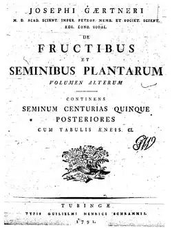 De Fructibus et Seminibus Plantarum, also known by its standard botanical abbreviation Fruct. Sem. Pl., is a three-volume botanic treatise by Joseph Gaertner. The first volume was published in December 1788. The second volume was published in four parts, in 1790, 1791, 1791, and 1792 respectively. A third volume was published after Gaertner's death by his son Karl Friedrich von Gaertner from 1805 to 1807; this final volume is also known as 'Supplementum Carpologicae', abbreviated as Suppl. Carp.. Most of the illustrations for the work were done by Johann Georg Sturm (1742-1793).[1]