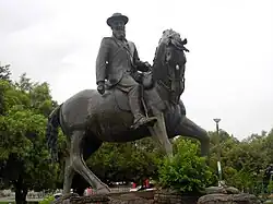 De la Rey was buried in the Lichtenburg graveyard, where a bronze bust by sculptor Fanie Eloff adorns his grave. De la Rey's home on Elandsfontein was demolished during the Boer War, but was rebuilt on the same foundation in 1902. The Voortrekkers movement placed a small memorial to him on his farm. De la Rey's equestrian statue on the De la Rey square of Lichtenburg's city hall, was sculpted by a town resident, Hennie Potgieter.[8]