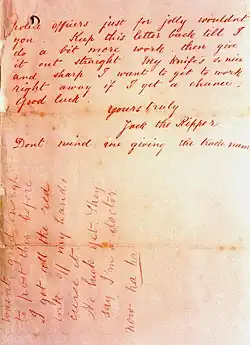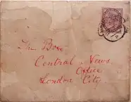 - ^ The "Saucy Jacky" postcard was a postcard addressed to the Central News Agency postmarked 1 October 1888. The author of this postcard is believed to be the same individual[8] who authored the "Dear Boss" letter.[9]