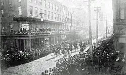 Jefferson Davis died at 12:45 a.m. on Friday, December 6, 1889.[1][2] His funeral was one of the largest in the South, and New Orleans draped itself in mourning as his body lay in state in the City Hall for several days. An Executive Committee decided to emphasize his ties to the United States, so an American national flag was placed over the Confederate flag during the viewing, with many crossed American and Confederate flags nearby. Davis wore a new suit of Confederate grey fabric Jubal Early had given him, and his widow Varina placed a sword Davis had carried during the Black Hawk War on the bier. A common decoration during the initial funeral was a small American flag in mourning, with a portrait of Davis in the center. The Grand Army of the Republic had a prominent role, even though the Grand Marshall was John G. Glynn, head of the Louisiana National Guard, and Georgia Governor John Gordon (head of the newly organized United Confederate Veterans) was honorary Grand Marshall.[3] While the federal government officially ignored Davis's death, many church bells rang in the South, Confederate veterans held many processions, and senators and representatives crossed the Potomac River to join former Confederate officials and generals in eulogizing Davis in Alexandria, Virginia.[4]