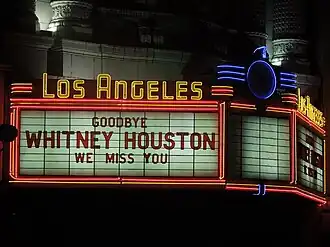 ![]() A "We miss you" message displayed for Whitney Houston at the Los Angeles Theatre following her death, February 11, 2012 | |