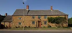 Many of Deddington's buildings are built of local Jurassic marlstone. It has an iron oxide content, giving it a rich brown colour characteristic of building stone in north Oxfordshire and neighbouring parts of Northamptonshire and Warwickshire. Leadenporch House in New Street is a 14th-century building. By the 15th century it was the house of a small manor held by the Dean and canons of St George's Chapel, Windsor Castle. It had a Medieval hall, open to the rafters until an intermediate floor was inserted in the 17th century. The house became run down but was restored some time between 1834 and 1843.[47] It is Deddington's only Grade I listed building. It was first listed in December 1955 but the entry was amended in May 1988. The description states "substantial farmhouse now house. Early C14, re-modelled mid/late C17, altered and extended early C19" and adds that this is "one of the earliest and most complete medieval hall houses of the Banbury region".[48]