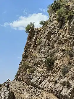 Over hundred years ago grazing has become an ever greater problem with the growth of population and livestock. Dehibolo is located under a 150-200 meters high mountain wall, while on the other side of the ridge the slope is gentle with places suitable for grain fields and pastures, inaccessible because of the wall. A rich widow, Bibi Shah, who owned a large herd of sheep and goats, cattle and horses, and employed many shepherds and servants, proposed to finance a wide trail which would cross the wall. The stonemasons, led by master Olim, built a 500-meter long trail west of the village, in places cut into the cliff and, where necessary, reinforced with wooden rebars.[2] In her honor the path was named "Bibi Shah trail" (Bibishoh shotisi). In 1975 the trail was renovated. It was mentioned in the film "Forgotten Songs" about Boysun, directed by Temurmalik Yunusov.[2][8][9]