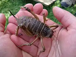 The Cook Strait giant wētā is one of the largest insects in the world, reaching up to 7 centimetres (2.8 in) long.[3] The brownish-yellow body is bulky and heavily armoured, with the upper surface covered by a series of thickened, overlapping plates, which have black markings. Relative to the size of the head, the jaws are large, and the elongated hind legs have five or six large spines, and can be raised above the head in defence. The female is significantly larger than the male, and both sexes lack wings.[4]