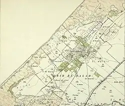 A substantial part of Deir al-Balah's inhabitants died in 1862 because of stagnant drinking water originating from the town's swamps. The swamps were seasonal, forming each winter as a result of flooding which failed to breach the sandstone ridge.[25] A year later, on 29 May 1863, French explorer Victor Guérin wrote that Deir al-Balah was a small, partly ruined village with a population of 350. Date farming was the principal economic activity that the inhabitants engaged in.[48] In 1878, the PEF's Survey of Western Palestine noted Deir al-Balah had grown to become a large village of mud houses "with wells and a small tower". At the time, it served as a see of the Greek Orthodox Church of Jerusalem.[12][49][50][51]