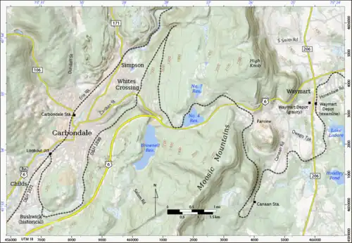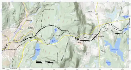 The steam line followed the route of the loaded track between Waymart and Honesdale, and a new alignment from Waymart to Carbondale was built around the foot of Moosic Mountain, looping south to Canaan and rejoining the light line near the head of plane no. 20 at Rix's Gap, where it continued along the light route to Bushwick and Lookout Junction. The hairpin turn at Shepherd's crook was replaced with a switchback.