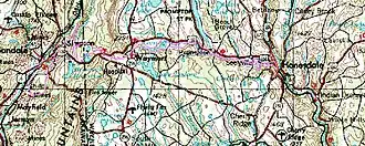 The descent of loaded cars between Waymart and Honesdale was interrupted by only a single plane at Prompton, where the track crossed to the north bank of the river and followed its course to Honesdale. From Waymart to Prompton, loaded cars coasted down the "six-mile level" (9.7 km), and after descending the plane at Prompton, were drawn by horses to the Honesdale terminal over the "four-mile level" (6.4 km). The levels were graded so that gravity alone would carry loaded cars on the six-mile level descending at the rate of 44 feet per mile (8.3 m/km), while the four-mile level descended at 26 feet per mile (4.9 m/km) and required horses in both directions, with one horse towing 5 cars.[4]