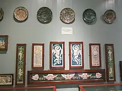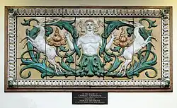 Dressler was mainly responsible for the decorative architectural panels, many of which can still be seen in the local area of Birkenhead and Liverpool, as well as in the local museums. The brightly coloured panels, inspired by the work of the Florentine sculptor Luca della Robbia and his family, did not prove to be very popular on the dark brick buildings of the period, the pottery turning to large two-handled vases, presentation wares, wall chargers and plates, as well as ceramic clock cases, tiled window boxes, numerous types of vases and similar wares, as a source of income. Dressler left the pottery in 1897 to establish his own pottery, the Medmenham Pottery, in Marlow, Buckinghamshire.[1]