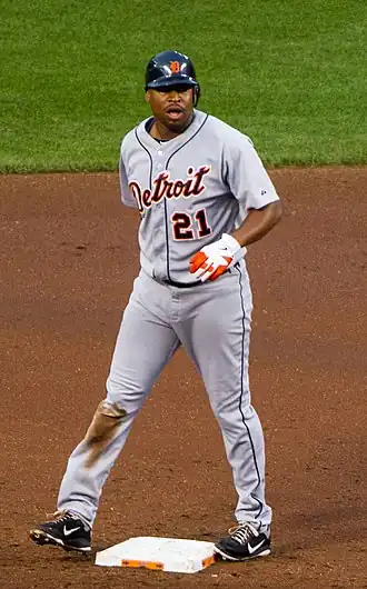 In his first at bat in the playoffs as a Tiger, Young hit a home run to right field off CC Sabathia in Game 1 of the 2011 ALDS.[21] In addition to his earlier post-season home run, he hit the game-winning home run in the bottom of the seventh inning in Game 3 off Rafael Soriano, giving Detroit a 2–1 lead over the New York Yankees.[22] In Game 5, Young suffered a strained oblique muscle and was left off the ALCS roster.[23] He was activated to play in Game 2. During Game 5 of the ALCS against the Texas Rangers, Young hit two home runs off C. J. Wilson, scoring three runs. He is the fourth Detroit Tiger to hit more than one home run in a postseason game (after Alan Trammell, Kirk Gibson and Magglio Ordóñez).[24]