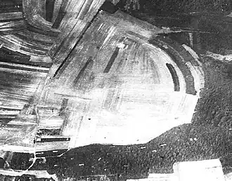![]() Delouze Aerodrome looking northwestwards. Note the numerous buildings in the forest, at the bottom of the photo, to the south of the open airfield, using cut agricultural fields, their furrow lines evident. | |