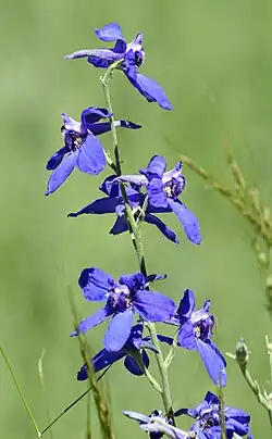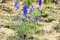 The wildflower author Claude A. Barr considered plains larkspur to be "arresting in the intensity and depth of its textured blueness." In gardens it has good drought resistance, but requires good moisture and soil to maximize its bloom.[4] It is on the City of Fort Collins' recommended plant list for its very low water usage and for its value as a nectar source for insects. However, the plants have limited availability in the horticultural trade.[23] Seed germination when planted outside in the fall is 57%, but drops to only 5% if not cold stratified.[24] Plants can be successfully transplanted, though like many plants this is more successful if done while plants are small and in dormancy with plenty of soil around the roots.[25] Plains larkspur is known to be winter hardy in USDA zone 4, a minimum temperature of about −34 °C (−29 °F).[26] Plains larkspur seeds were offered for sale as early as 1916 and regularly through the 1930s by Rockmont Nursery.[27][28]