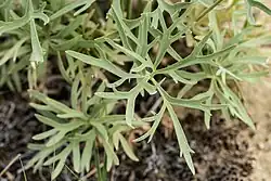 The leaves of Delphinium geyeri are roughly round in outline, but deeply divided into 7–20 pointed lobes that are 1–6 centimeters (0.39–2.4 in) wide. The end lobes of the leaves are 2–5 mm wide on basal leaves and 2–4 mm wide on flower stem leaves. As with the stem, the leaves are covered in fine hairs and are light green in color.[2] The similarly split leaves of Geraniums such as Geranium caespitosum are sometimes mistaken for those of D. geyeri, but they have much shallower leaf divisions and greater leaf area.[3] The leaves develop earlier than many other plants in its habitat.[6] The narrower and greater number of leaf divisions help to distinguish D. geyeri from other western tall larkspurs.[5]