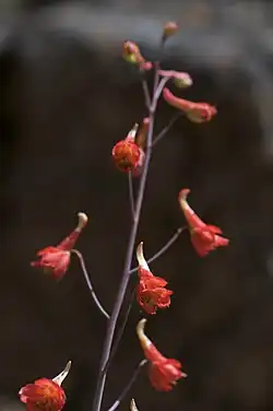 Delphinium nudicaule, known by the common names canyon larkspur, red larkspur, orange larkspur, and canyon delphinium, is a flowering herbaceous perennial plant in the buttercup family Ranunculaceae. It is native to low-elevation canyons and slopes, foothills, and mountain ranges of California, US, from the Sierra Nevada to the California Coast Ranges, and of Oregon. It grows below 6,500 feet (2,000 m).[1]