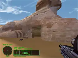 Delta Force: Land Warrior finally used a polygon based rasterizer with hardware acceleration for all its visuals. While the terrain was still present as a heightmap it was now rendered with polygons. Draw distances remain on the same level as in the earlier engines and maps are looped in all directions so there are no visible map borders. The new engine also allows for tunnel complexes, featured prominently in the campaign and showcased in the first mission which mostly takes place in Egyptian ruins.