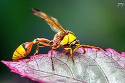 Delta esuriens is a species of potter wasp found in tropical Asia, belonging to the Vespidae family. They can be separated from the similar looking Delta pyriforme by the presence of a yellow band on the metasomal petiole segment.[1][2]