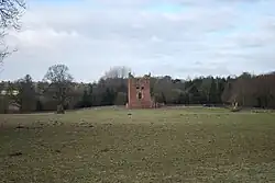 This fortified tower was built by Sir John Delves in 1364,[2] on the site of a former moated manor house. The tower was initially free-standing and was probably intended as a place of refuge for the family. In the 17th century it was incorporated into a range of domestic buildings known as Doddington Hall.[3] In the Civil War the hall became a garrison for the parliamentary forces. It was taken for the king by Lord Byron in January 1644 but retaken shortly after.[2] In 1727 the house and estate passed to the Broughton family.[4] The house was demolished around 1777 and replaced by the new Doddington Hall, leaving the tower as a landscape feature which was possibly used as a gazebo or a banqueting pavilion.[3] The external staircase to the former house was retained when the house was demolished and it was attached to the tower.[4]