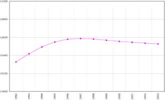 | 1993 | 10,390,945 | 140,985 | 107,396 | 33,589 | 13.6 | 10.3 | 3.2 | 1.97 | 2,476,910 |