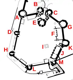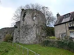 The walled circuit recommences in the north-east corner of the town, where the walls survive up to 15 feet (4.6 m) high, further protected by the two-storey tall North-Eastern Tower.[85] On the eastern side of the walls, the original defences had been set back from the edge of a rocky salient, protected by the Countess Tower, an angular, two-storey building with two towers.[86] The defences were adapted to follow the outer edge of the salient, with the Goblin Tower built on the outermost point, overlooking the edge of the cliffs.[86] The Goblin Tower is a hexagonal, two-storey tower, protecting a deep well that formed the only reliable source of water for the defences during the summer.[87]