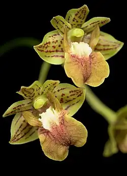 Dendrobium bifalce, commonly known as the native bee orchid,[2] is an epiphytic or lithophytic orchid in the family Orchidaceae. It has spindle-shaped pseudobulbs with up to four leathery leaves and up to ten pale green or greenish yellow flowers with purplish markings. It grows on trees and boulders in rainforest in tropical North Queensland, Australia and in New Guinea.