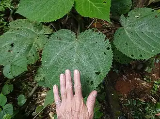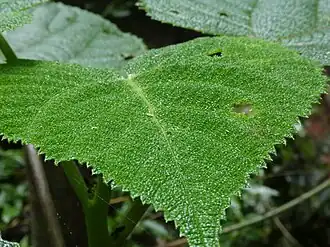 D. cordifolia is a straggly perennial shrub growing up to 10 m (33 ft) high, and the entire plant is covered with stinging hairs.[4][6] It has large cordate leaves measuring up to 25 cm (9.8 in) long by 22 cm (8.7 in) wide, with toothed margins and petioles (leaf stems) almost as long as the leaf blade itself.[6]