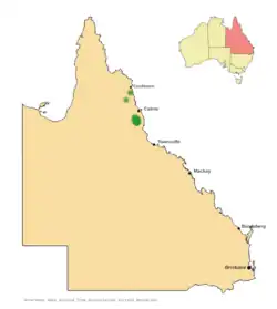 D. cordifolia is restricted to a small part of north-eastern Queensland, specifically the Atherton Tableland and nearby areas, at elevations from 100 to 1,200 m (330 to 3,940 ft).[4] It grows as an understory plant in disturbed areas of rainforest, such as treefalls, creek margins, roadsides, and man-made clearings.[4]