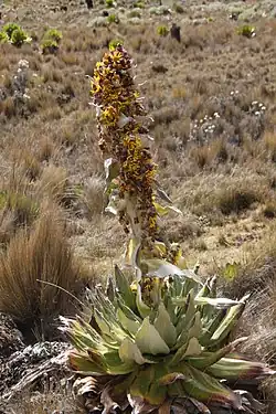 Senecio keniensis makes its home mostly in the lower alpine or moorland zone located at altitudes of 2,900 metres (9,500 ft) to 3,800 metres (12,500 ft)[4][5] that can be characterized by high soil moisture, a thick humus layer, similar terrain, and not a lot of different species present. The upper alpine zone, 3,800 metres (12,500 ft) to 4,500 metres (14,800 ft), is more topographically diverse, and contains a more varied flora, including the giant rosette plants Lobelia telekii and L. keniensis, Senecio keniodendron and Carduus spp.. S. keniensis can be found in both the lower and upper alpine zone,[11] although it is less common above 4,000 metres (13,000 ft) where it can regularly hybridise with S. keniodendron.[4][12]