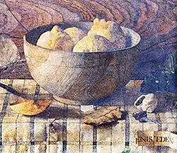 As Denis Eden re-established himself as an exhibiting artist after the war, A Posy from the Red Lion was shown by the Oxford Art Society at the Ashmolean Museum in Oxford in 1919. The Oxford Chronicle considered it 'by far the best flower picture' in the exhibition.[83] Between 1919 and 1923 Eden had twelve paintings selected for the Royal Academy summer exhibitions; these were mainly still-life compositions – perhaps more sellable than big statement works. It seems as if he was acting on the advice given in The Times in 1909 to 'eschew eccentricity of subject and be content with something simple and beautiful'.[48] The punningly titled Souvenir d' Hélène – another flower picture[84] – in 1919 was followed by The Bowl of Lemons in 1920, in which Eden showed an ongoing referencing of Northern Renaissance still-life painting, including the placing of his a signature on a trompe l'œil 'label'.[85] The Brown Jug was shown in the same year, while Unconsidered Trifles, Petals and Pewter and Good News from a Far Country appeared in 1921; The Province of the Woodpecker, Chrysanthemums and Amber, Saffron and Cinnabar in 1922; and Copper and Brown and The Advocate's Door in 1923.
