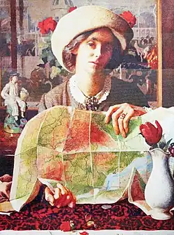 Perhaps not wanting to be seen only as a 'neo-Pre-Raphaelite', Eden painted Griselda at the 'Wheatsheaf' in 1911, motivated by the 'idea to make a modern picture'.[55] This portrait of the artist's wife nonetheless makes playful reference to Northern Renaissance portraiture – with a shallow pictorial space and being crammed with potentially symbolic artefacts. The reference to Helen as 'Griselda' should not, one suspects, be taken too seriously, but in referring to Chaucer's 'The Clerk's Tale' (from The Canterbury Tales) there is surely a tribute to Helen as the loyal wife. The painting is presented as something of a 'problem picture' – a narrative tease by the artist of a kind that was popular at the Royal Academy from the turn of the century. Eden explained that 'There's no story connected with the picture … Everyone must make their own.' He went on to say that 'We were in rooms at the time it was painted, househunting, and Griselda is a portrait of my wife. She is supposed to be stopping at an inn, where she is opening a map to see the best route after having lunched'.[56] The Wheatsheaf Inn at Braishfield, Hampshire, is seven miles from Michelmersh – the village to which the Edens moved – and may be the inn referenced in the picture's title.[57]