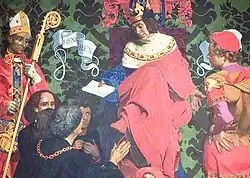Eden's friend Frank Cadogan Cowper, along with the artist Ernest Board, had been working as a studio assistant on mural projects for Edwin Austin Abbey, such as the monumental canvas The Coronation of King Edward VII, now in the Royal Collection. In 1908 Abbey was appointed artistic advisor on a mural project for the House of Commons' East Corridor, where six spaces had been allocated for a series of large panels (81 inches by 83 inches) on the theme of the Tudor period. In order to create stylistic unity, Abbey chose six young artists working in a 'neo-Pre-Raphaelite' mode, and further unifying aspects in relation to colour and scale were imposed on them. Frank Cadogan Cowper, Eden, Board and Byam Shaw were joined by Henry Payne and Frank O. Salisbury. Salisbury had just finished the mural decorations with Abbey at the Royal Exchange, London, and Payne was a Birmingham artist who worked primarily in large-scale stained glass.[49] The artists were paid £400 each.[50] An article in The Times explained that 'The process adopted is not that of fresco proper … but one more suited to the London air – that known as marophlage [or marouflage], in which the paint is laid on canvas, which is afterwards fastened to the wall.'[51] Eden's allocated subject, John Cabot and His Sons Receive the Charter from Henry VII to Sail in Search of New Lands, 1496, celebrates Tudor global dominance at sea. The mural would be his most high-profile and most lucrative work – although when the series was presented to the public its neo-Pre-Raphaelite style was not to everyone's taste.[52]