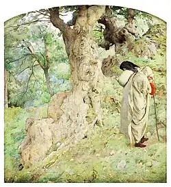 The First World War began in July 1914, and by the time of the following year's Royal Academy summer exhibition the Edens had purchased a property in the Cotswolds: Waterfall House in the medieval town of Burford, Oxfordshire.[73] The public showed little appetite for purchasing art at this time of crisis, and The Old Apple Tree[74] was not sold when exhibited at the RA in 1915. However, it was bought later in the year when it was exhibited in Walker Art Gallery's autumn exhibition and it was gifted anonymously to the gallery.[75]