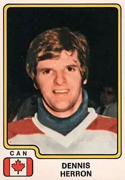 Denis Bernard Herron (born June 18, 1952) is a Canadian former professional ice hockey goaltender who played for the Montreal Canadiens, Kansas City Scouts, and Pittsburgh Penguins in the National Hockey League from 1972 to 1985. He won the William M. Jennings Trophy with Rick Wamsley in 1982.