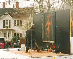 A Denny Dent performance, which he referred to as a "Two-Fisted Art Attack," consisted of him rapidly painting on a 6-foot-tall (1.8 m) black canvas with multiple brushes in both hands, as well as painting with his bare hands, to a musical accompaniment. Over the course of just a few pop/rock songs, he would complete a portrait. His subjects were most often musicians, but also included other entertainers, sports figures, and political leaders. One of his most famous performances was at the Woodstock '94 concert.[3]