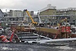 Final approval for the project was granted in August 2015 by the Seattle City Council, who also approved the substation's unconventional design incorporating public benefits in exchange for a street vacation.[13] Walsh Construction was awarded the construction contract for the substation project, working alongside subcontractors Valley Electric, W.A. Chester and Transcon.[14] Construction of the substation began in May 2016,[15] and by the end of the year, the first outer walls were erected.[16] The substation's three transformers, each weighing 6.5 short tons (5,900 kg), were installed in 2017.[17]