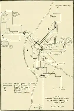Land speculators, not served by the existing railway and believing that they needed street railway service to get better value from their real estate, launched the Denver Electric and Cable Railway Company in 1885. Incorporated for fifty years, this service was to run on electricity or by cable. Fearing these new methods would prove unprofitable, the Denver Electric and Cable Railway Company, petitioned for and were given the right to use horse-power, despite the Denver City Railway Company's exclusive horse railroad franchise.[2] Some of the initial investors then spun off a new company, The Denver Railway Association, which was given the rights to horse railways. This move was very unpopular with both the Denver City Railway Company and the remaining investors in the Denver Electric and Cable Railway Company. Thus the Denver Railway Association was reincorporated and the newly consolidated company renamed the Denver Tramway.[2]