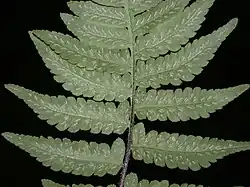 Deparia petersenii, commonly known as the Japanese lady fern, is a species of fern that generally grows between 12 and 24 inches (300 and 610 mm) in length and has a width of between 12 and 18 inches (300 and 460 mm). This fern does not have any flowers and can be easily identifiable having gray hairs that grow on the underside of the leaves.[1] This perennial fern is an aggressive fast growing invasive species known for long rhizomes and ability to form a thick ground cover. D. petersenii is sometimes cultivated and can be purchased online because it is not regulated or prohibited.[2]