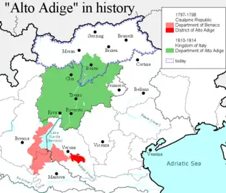Under the Cisalpine Republic a district of Alto Adige (Distretto dell'Alto Adige) was created as a part of the short-lived "Department of Benaco". The District of Alto Adige included some municipalities of today's province of Verona.[2][3] The Department of Benaco, which was created in 1797, was disbanded in 1798 and with it the District of Alto Adige after a structural reorganization of the Napoleon's Italian republic.