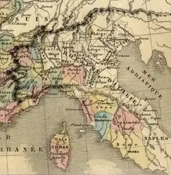 ![]() French map of Napoleonic Italy, with the department of Alto Adige (French: Haut-Adige) located in the north | |