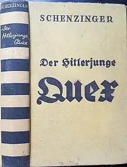 The novel Der Hitlerjunge Quex was written by Karl Aloys Schenzinger between May and September 1932.[1] It was first published in the Nazi Party newspaper Völkischer Beobachter and as a book in December 1932.[1] A required reading for Hitler Youth members,[1] it had more than 190,000 copies sold within two years[9] and more than 500,000 copies by 1945.[1]