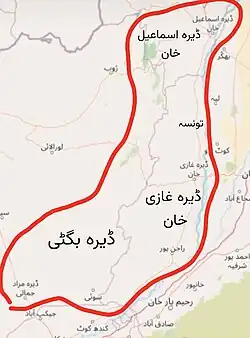| Note: Including Dera Ghazi Khan District, Punjab, Biloch Trans–Frontier Tract, Punjab, Dera Ismail Khan District, North-West Frontier Province, Loralai District, Balochistan, and Sibi District, Balochistan (Administered Areas and Marri-Bugti Country). District borders are not an exact match in the present-day due to various bifurcations to district borders — which since created new districts — throughout the region during the post-independence era that have taken into account population increases. | ||||||||||