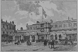 Although some sources refer to it as the 'Tripartite Station'.[6] it became known as the 'Tri Junct Station',[4][7] It was 1,050 ft (320 m) long with one through platform plus a north and a south bay, the main platform and bays connected to seven stabling roads by a series of carriage turntables (rolling-stock was moved around the station by hand). These platform and stabling roads were all beneath a three-bay train shed.[8]