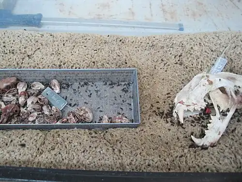 A dermestarium (pl. dermestaria) is a room, container, or terrarium where taxidermists let invertebrates - typically beetle larvae - remove (eat) flesh and other soft parts from animal carcasses or parts of animal carcasses, such as skulls. The purpose is to expose and clean individual bones or entire skeletons for study and preservation.[1] The word dermestarium derives from Dermestes, the genus name of the beetle most commonly used for the task. Other invertebrates, notably isopods and clothes moths, have also been used.[2]
