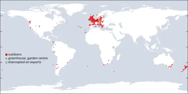 - Canada: Quebec (greenhouses 1966),[39] British Columbia (1974),[40] Alberta (2021),[41] Newfoundland (2012).[42] Records from Ontario require confirmation.[8]