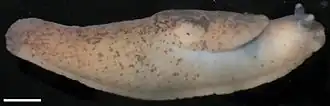 Adults are usually 20–35 mm long.[2] The skin and flesh are watery and fairly transparent.[3] The colour of the skin varies between light greyish-brown to almost black. Close inspection reveals fine dark spotting usually over the whole body; this shows up better in alcohol-preserved specimens.[2] Often, but not always, the respiratory pore is pale and unspotted.[3] The mucus is colourless.