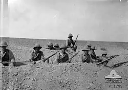 To prepare for the coming offensive each man was issued an officers-style saddle wallet, in which they could carry three days' rations and some spare clothing. Attached to the saddle were two nosebags with nineteen pounds (8.6 kg) or two days of grain for the horse. A third day's grain and two days' rations for the men were carried with the divisional train.[36][37] Every two weeks the forward division would move en masse towards Beersheba; leaving in the afternoon they marched all night to be in a position on the high ground in front of town by dawn the next day. There they remained all day and returned to their base the following night. These long-range patrols got the men and horses used to desert travel, with no water available for the horses from the afternoon they left until they returned.[35] These patrols were not without danger and they were often attacked by Turkish aircraft and artillery which had previously registered approach routes, wadi crossings and the high ground.[38] The patrols accustomed the Turks to the appearance of British troops in front of Beersheba, without them taking any offensive action before withdrawing again.[39] This patrol routine continued until the end of October when the corps moved forward for the coming offensive.[40]