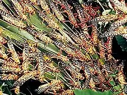 Crop loss from locusts was noted in the Bible and Qur'an; these insects have been documented as contributing to the severity of a number of Ethiopian famines. Since the early 20th century, desert locust plagues occurred in 1926–1934, 1940–1948, 1949–1963, 1967–1969, 1987–1989, 2003–2005, and 2019–2020.[21] In March–October 1915, a plague of locusts stripped Ottoman Palestine of almost all vegetation.[22] The significant crop loss caused by swarming desert locusts exacerbates problems of food shortage, and is a threat to food security.