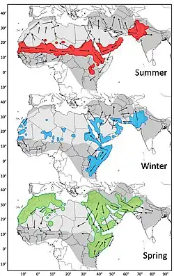 In southwest Asia, the upsurge was brought under control much earlier because of a massive effort undertaken by India and Pakistan along both sides of their common border during the summer of 2020 that followed from earlier control operations during the spring of 2019 and 2020 by Iran and during the summer of 2019 by Pakistan and India.[43] In June 2020, Cyclone Nisarga helped spread swarms across the northern states of India where a few reached the Himalayan foothills in Nepal.