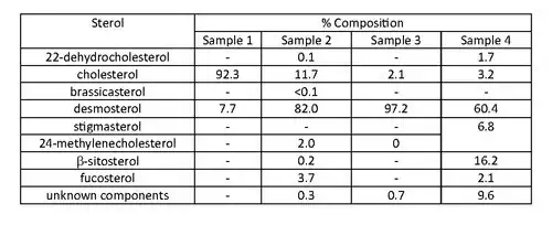 In the 1968 paper by Idler, Saito and Wiseman,[10] dulse samples were analysed and the sterols present were determined by gas liquid chromatography. Samples were collected near Grand Manan Island, New York in 1964 and 1965, and showed a significant difference in the presence of desmosterol. Samples 1 and 2 were from the same source, as were samples 3 and 4, and all samples were harvested at different times. Samples 2, 3, and 4 had the major sterol as desmosterol, compared to sample 1, with the major sterol being cholesterol.[10] This indicates a 70% difference in desmosterol composition in the sterol samples (1 and 2) over a period of one year. There has been no conclusive evidence to show whether seasonal variation of sterols in barnacles occur.