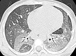 | Chest computerized tomography scan showing diffuse ground-glass opacities with air-bronchograms in the upper lobes and the left lower lobe. | |